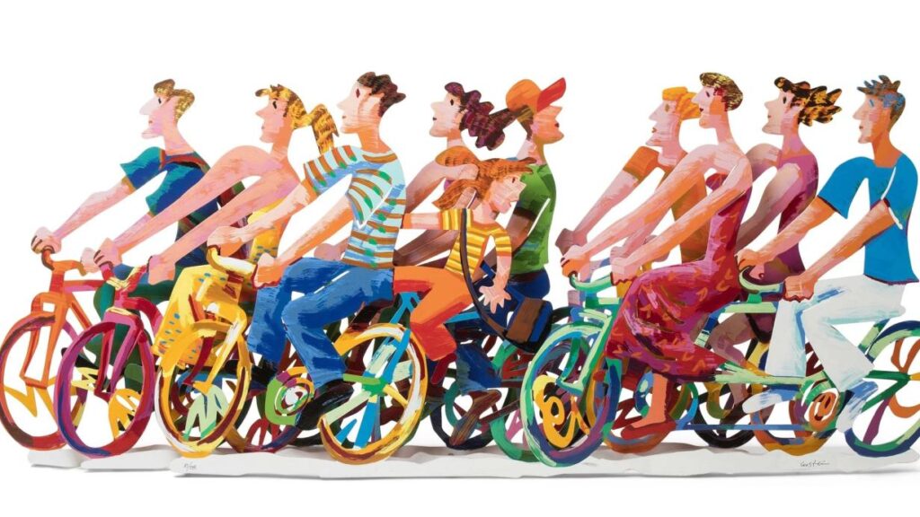 David Gerstein schneidet Stahl und Aluminium aus und lackiert sie, um seine Figuren und Szenen in dreidimensionale Strukturen und Wandgestaltungen einzubetten, die sowohl unveränderlich als auch pulsierend sind. Die von ihm geschaffenen „Bilder“ und Kompositionen stammen aus der Welt der Kindheit, aus dem Alltag, der Familie, dem Sport, der Musik, dem Stadtleben, der Tier- und Pflanzenwelt. Die verschiedenen Schichten sind im Abstand von etwa 5 cm an der Wand montiert und lassen so Einblicke aus verschiedenen Perspektiven zu. Ganz ähnlich wie auch bei den Cutouts von Alex Katz die bei FRANK FLUEGEL GALERIE zu kaufen sind, werfen diese Schatten und grafische Muster an die Wand und verschmelzen dadurch mit dem Raum in dem sie ausgestellt sind.