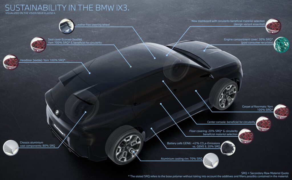 Bei der Entwicklung des BMW iX3 hat die BMW Group das Prinzip „Design for Circularity“ systematisch angewandt. Dieses umfasst die Ansätze „Secondary First“, also den bevorzugten Einsatz von Sekundärmaterialien, gezielte „Materialauswahl” und „Demontageoptimierung“. Im Ergebnis besteht der neue BMW iX3 50 zu rund einem Drittel aus sekundären Materialien.
