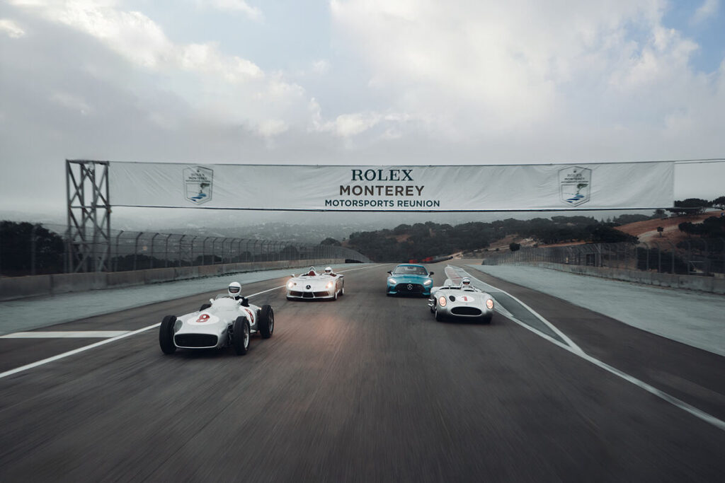 75 Jahre Formel 1 war Thema auch in Laguna Seca, der legendären Rennstrecke nahe Pebble Beach: Im Jubiläumsjahr faszinierte hier der Formel 1-Rennwagen W 196 R (bis zu 213 kW/290 PS) aus der Unternehmenssammlung auf dem Kurs. Mit dem Silberpfeil kehrten die Stuttgarter 1954 in den Grand-Prix-Sport zurück, Juan Manuel Fangio gewann damit die Weltmeisterschaften 1954 und 1955. Weiterhin begeisterten ein Mercedes-Benz 300 SLR Rennsportwagen (W 196 S, bis zu 228 kW/310 PS), ebenfalls aus dem Jahr 1955, sowie der offene Hochleistungssportwagen SLR McLaren Stirling Moss (Z 199, 478 kW/650 PS) aus dem Jahr 2009. Das Buchstabenkürzel SLR verdeutlicht die ideelle Querverbindung zwischen beiden Fahrzeugen – der von Mercedes-Benz mit dem damaligen Formel 1-Partner McLaren entwickelte Supersportwagen greift die Tradition des berühmten Rennsportwagens auf. Vor 70 Jahren gewann die Marke mit dem 300 SLR die Sportwagen-Weltmeisterschaft. Legendär ist die Rekordfahrt von Stirling Moss und Denis Jenkinson bei der Mille Miglia 1955 in der besten jemals erzielten Zeit.