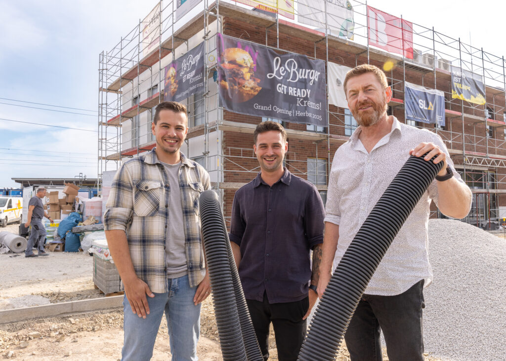 Frisch. Handgemacht. Mit Liebe gesmasht. Im November eröffnet das Wiener Familienunternehmen Le Burger seine modernste Burgermanufaktur Österreichs – direkt an der Wiener Straße 114 in Krems. Auf 440m² entsteht ein stylisher Gastronomie-Hotspot mit 138 Sitzplätzen im Innenbereich, einem 290m² großen Gastgarten mit Biotop (120 Plätze) und einem Drive-In für schnellen Genuss unterwegs. Noch sind die Bauarbeiter am Werk, doch schon bald übernimmt ein 35-köpfiges Team das Ruder – und serviert Smashburger aus täglich frisch vor Ort faschiertem Fleisch, veredelt mit regionalen Zutaten und hausgemachten Saucen zum Selberzapfen – so viel man will. Dazu gibt’s Steaks, Bowls, Salate und vieles mehr.