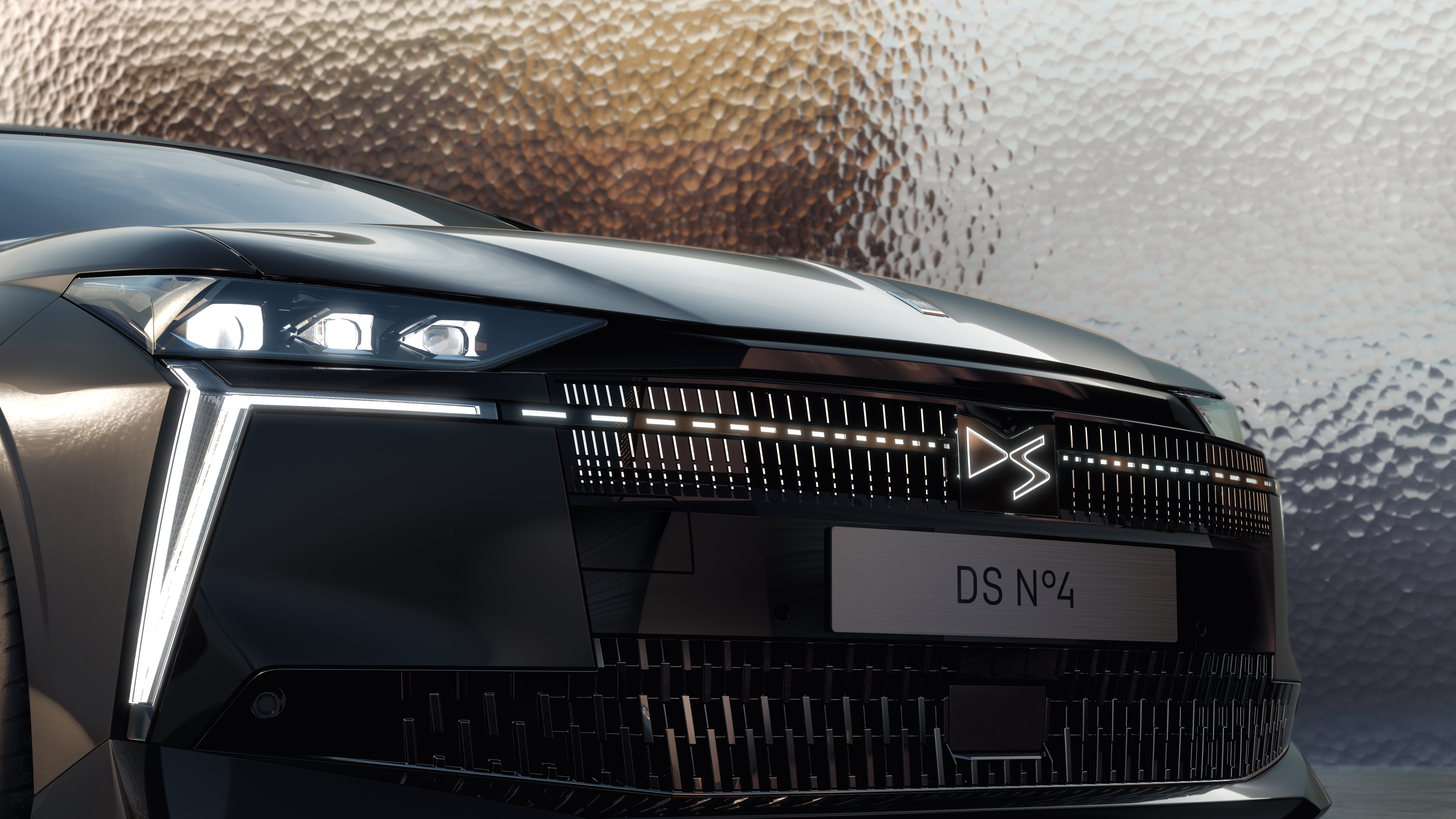 Die neu gestaltete Front des neuen DS N°4 betont eine horizontale Linienführung, die Technik mit Eleganz verbindet. Eine breite, tiefschwarze Kühlergrillfläche mit ausgeprägten Details trägt die neue Lichtsignatur, die vom Konzeptfahrzeug DS E-Tense Performance und dem DS N°8 inspiriert ist: Lichtstrahlen ziehen sich von den äußeren Enden der Frontstoßfänger in Segmenten zum beleuchteten DS Logo in der Mitte. Das unverwechselbare Lichtdesign verleiht dem N°4 eine einzigartige Präsenz und einen interessanten Look.