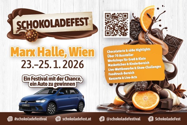 Nach dem Erfolg im Vorjahr kehrt das SchokoladeFest 2026 noch größer in die Wiener Marx Halle zurück. Vom 23. bis 25. Jänner laden über 90 Aussteller zu einer genussvollen Entdeckungsreise durch die Welt der Schokolade – von edlen Pralinen bis zu kreativen Kakaokreationen. Erwartet werden mehr als 25.000 Besucher – von passionierten Schokoladenfans bis hin zu Familien mit Kindern. Neu ist auch die die exklusive Eröffnungssoirée am 22. Jänner mit immersiver Performance, mexikanischer Kulinarik und weiteren Überraschungen. Tickets für das Festival sind ab 8 Euro erhältlich. Karten für die Eröffungssoriée um 60 Euro. Kinder unter 6 Jahren haben freien Eintritt. Ticketinfo: www.schokoladefest.at