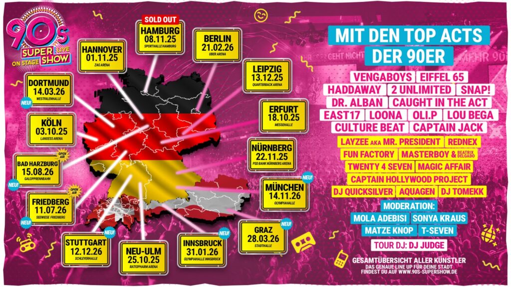 Die 90s Super Show holt die Musik und die Stars der Neunziger dahin zurück, wo sie hin gehören: auf die ganz große Bühne!Nach ausverkauften Veranstaltungen in Wien auf der Donauinsel und der legendären Kaiserwiese, kommt die 90s Super Show nach Innsbruck und Graz! Erstmalig können somit über 10.000 Fans das größte 90er Indoor Festival Österreichs und mit den Stars der VIVA- und MTV-Ära die größte 90er Party des Jahres feiern!