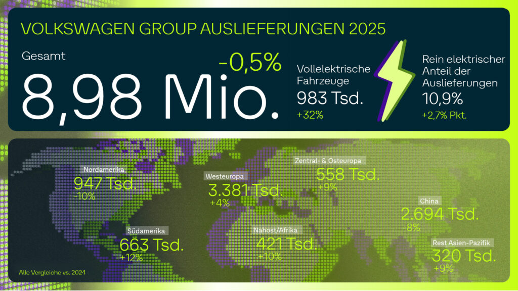 „Die Volkswagen Group war 2025 robust in der Spur – und das in einem anspruchsvollen Marktumfeld. Mit rund neun Millionen ausgelieferten Fahrzeugen bleibt unser Absatz stabil: Das liegt an unseren attraktiven Produkten, über alle Marken und alle Antriebsarten hinweg. Wir sind gut vorangekommen auf unserem Weg, unsere Produktpalette umfassend zu erneuern. Unsere neuen Fahrzeuge bekommen eine hervorragende Resonanz und werden vielfach ausgezeichnet. Mit mehr als 20 neuen Modellen setzen wir unsere Produktoffensive auch 2026 mit vollem Tempo fort. Darunter sind weitere innovative Fahrzeuge aus unserer Modelloffensive in China sowie unsere Electric Urban Car Family. E-Mobilität zum Einstiegspreis mit Top-Technologie von Volkswagen, CUPRA und Škoda – der nächste Schritt auf unserem Weg zum globalen Technologietreiber der Automobilindustrie.“