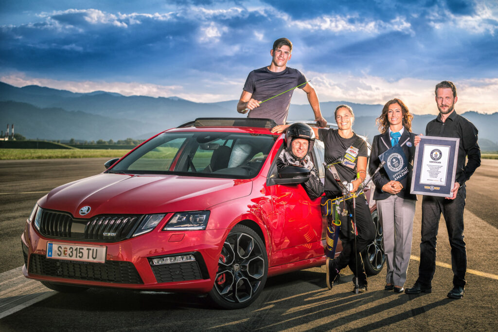 Der von Škoda Österreich aufgestellte Weltrekord rund um den Pfeil – dem zentralen Logo-Bestandteil von Škoda –, sorgte für weltweites Echo. Das denkbar unmögliche Vorhaben im Detail: Ein Pfeil wird von einer Bogenschützin abgefeuert und von einem fahrenden Auto aus mit bloßer Hand gefangen. Der Pfeil fliegt mit einer Geschwindigkeit von rund 215 km/h beziehungsweise 60 Meter pro Sekunde: Genauso schnell muss das Auto bereits an der Bogenschützin vorbeifahren, damit Fahrzeug und Pfeil auf gleicher Höhe sind und der Fänger überhaupt die Chance hat, den Pfeil zu fangen. Nach einer mehrmonatigen Test- und Planungsphase wurde der Pfeil schließlich nach 57,50 Metern aus dem Panoramaschiebedach eines serienmäßigen Octavia RS 245 gefangen. Der Weltrekord wurde Ende Juli 2018 in Anwesenheit einer Guinness World Records-Richterin auf der Start-Landebahn des Fliegerhorstes in Zeltweg (Österreich) realisiert. Das Weltrekordvideo ist hier aufrufbar.