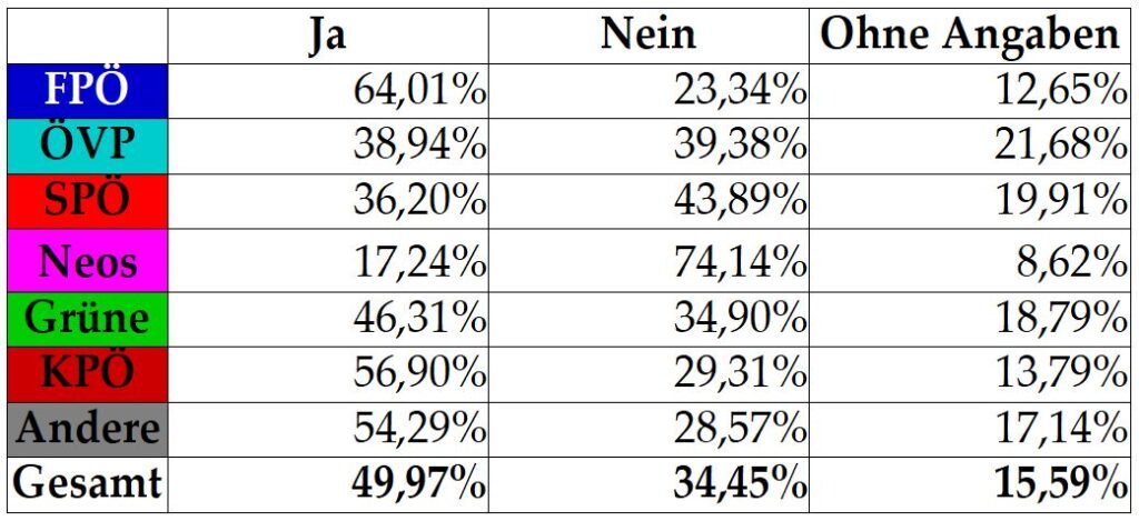 Das Resultat dazu haben wir wieder nach den Parteipräferenzen bei der Sonntagsfrage aufgeschlüsselt.