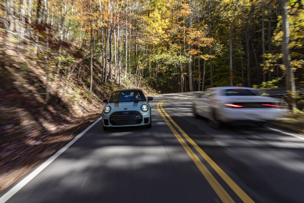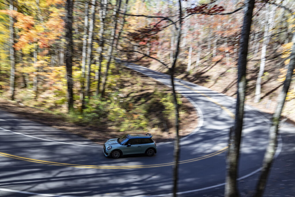 Asheville. Die Sonne strahlt. Das Laub schimmert in den Farben Gelb, Rot und Orange. Mittendrin der MINI John Cooper Works im Farbton Ocean Wave Green. Eine pittoreske Szenerie, typisch für die Great Smoky Mountains an der Grenze zwischen den US-Bundesstaaten North Carolina und Tennessee. Wenn da nicht der „Tail of the Dragon“ wäre. Die US-129 ist die gefährlichste Straße der USA: 17,7 Kilometer lang, mit 318 Kurven. Jede einzelne davon ist eine Herausforderung für Mensch und Maschine.