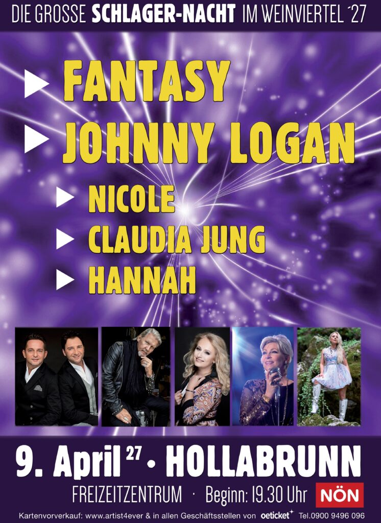 Nach der ausverkauften ersten Schlagernacht verwandelt sich Hollabrunn auch 2027 wieder in ein Mekka für heimische Schlagerfans. Am 9. April 2027 steigt im Freizeitzentrum die zweite Ausgabe von „Die große Schlagernacht im Weinviertel“ – mit einem Line-up, das die Herzen aller Schlagerliebhaber höherschlagen lässt. Auf der Bühne bringen Fantasy, Johnny Logan, Claudia Jung, Nicole und Hannah das Freizeitzentrum erneut zum Beben. Tickets ab 65 Euro auf oeticket.com oder artist4ever.at